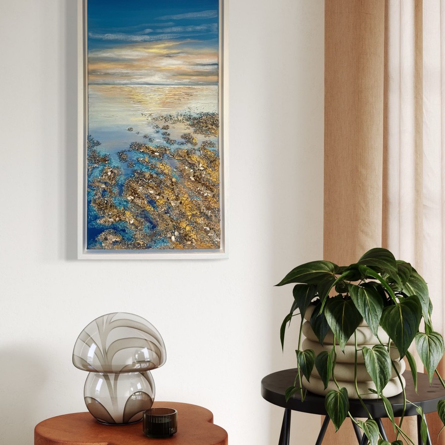 Golden light shimmers across the water, capturing the fleeting magic of twilight as the sea glows with warmth and brilliance. Swarovski crystals and gemstones reflect the ocean’s ever-changing beauty, evoking a sense of wonder and serenity. But beneath its radiance lies a fragile and mysterious world—one that must be cherished and protected.