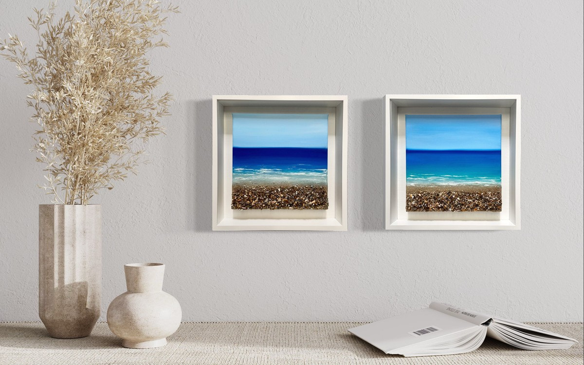 This sea painting would make a perfect addition to a beach-themed decor, adding a serene and relaxing ambiance to any room. It would be ideal for a living room or bedroom, evoking the beauty and tranquility of the ocean.