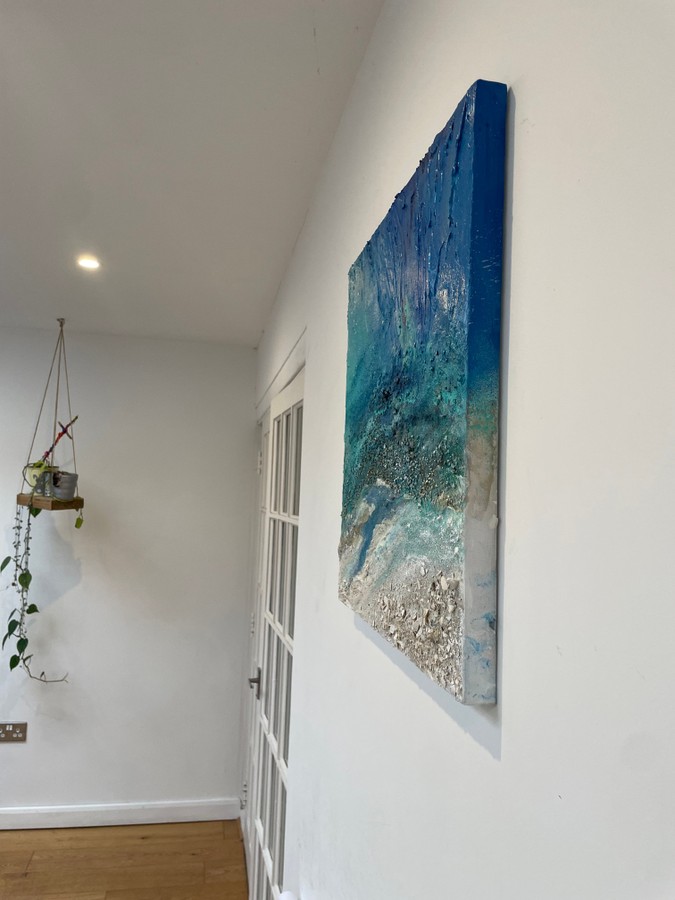 The coastline is in constant motion—eroding, shifting, transforming. Edge of Time captures the raw energy of the shore, where broken shells and crumbled chalk tell the story of cliffs lost to the tide. The chalk used in this piece was gathered from the fallen cliff between Saltdean and Telscombe, a place I’ve walked many times. Now, the erosion has made it nearly impossible to pass safely, the land continuing its slow collapse into the sea. This painting holds the fragility of these places within its layers—reminders of time, loss, and the force of nature at work.