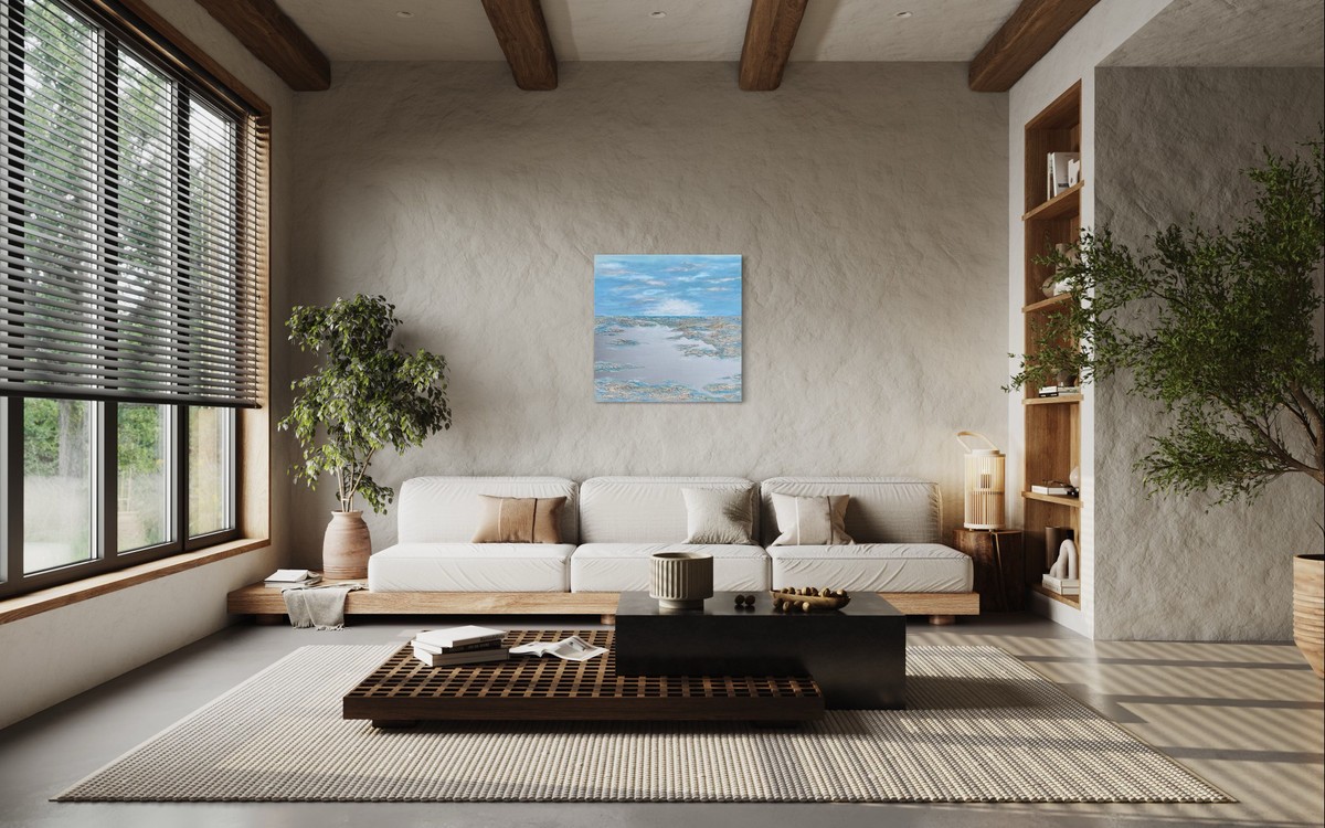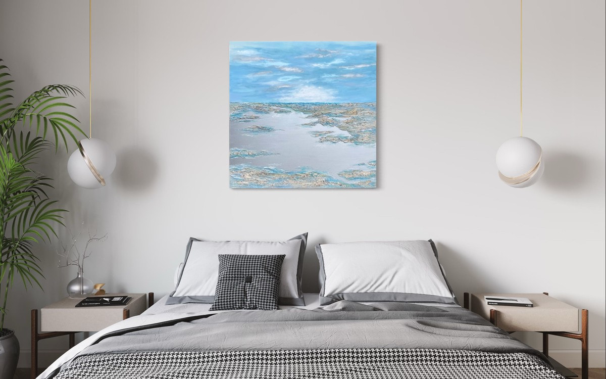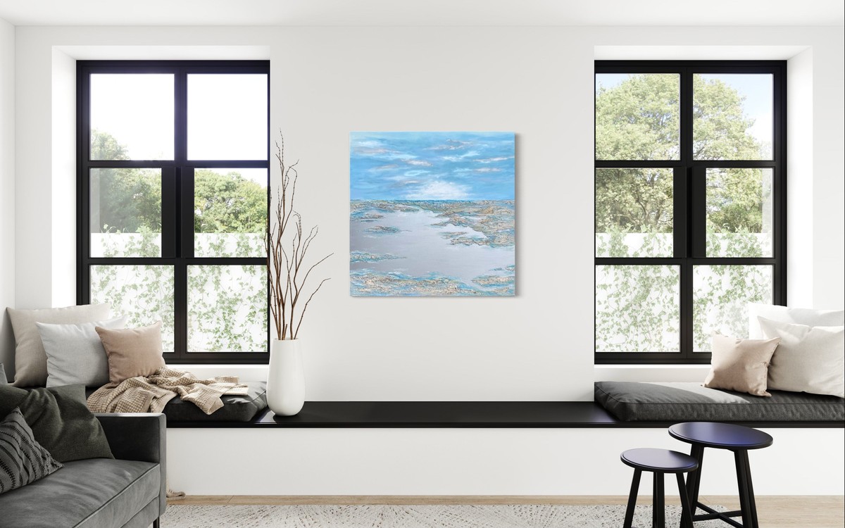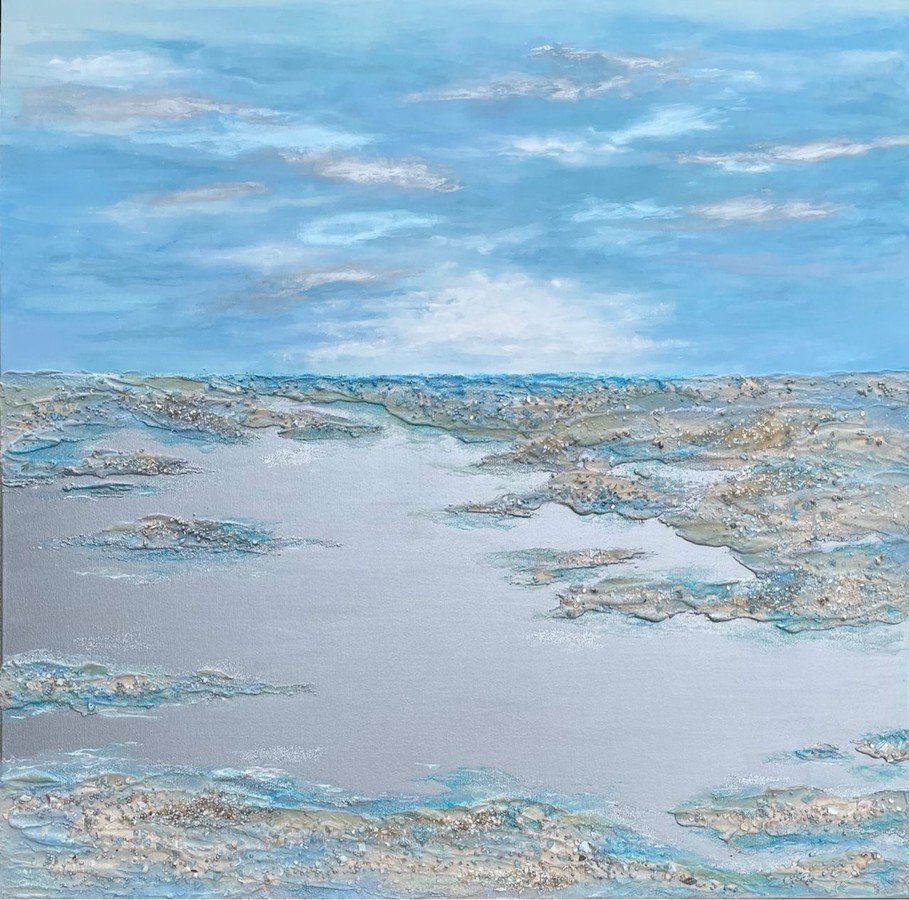 The artist is capturing the ocean's invitation to slow down and be quiet, to deepen our connection with nature and with ourselves, by meditating on the imagery of the calm seascape in all its glistening beauty.