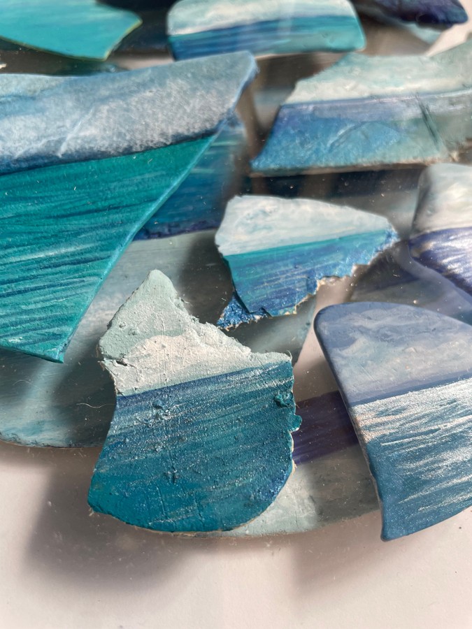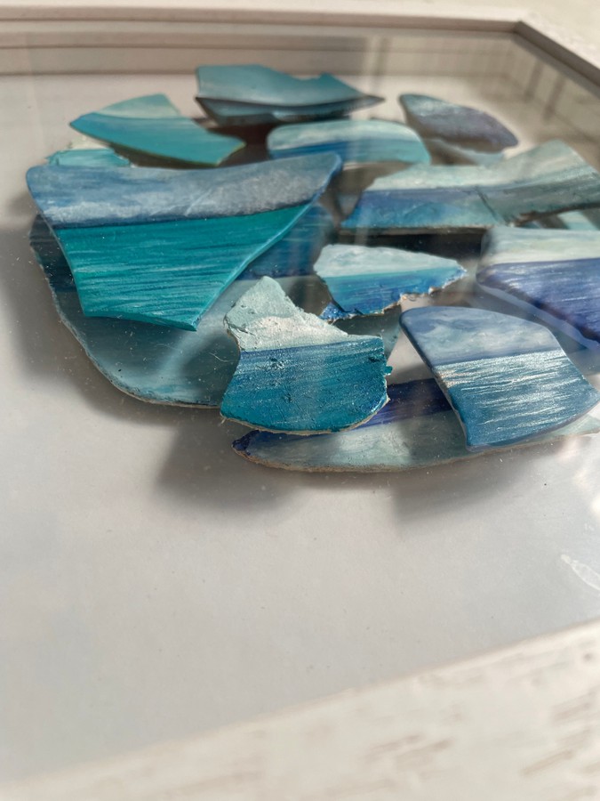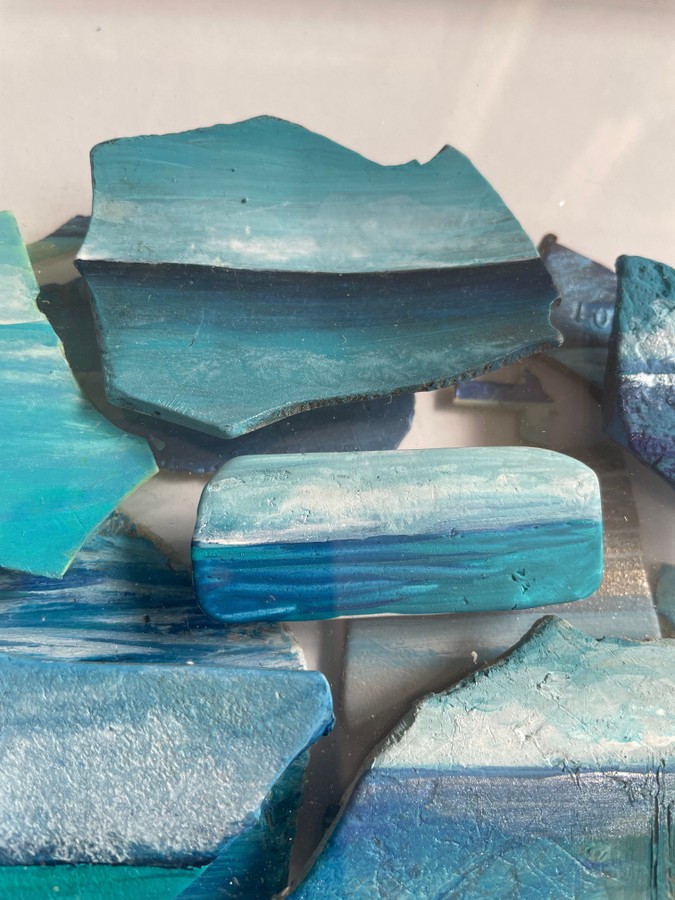 Every day, I stroll along the beaches of East Sussex with my faithful canine companion (Geoffrey, the Welsh Terrier). During low tides, especially after stormy nights or during spring tides following the full and new moons, the shoreline reveals its treasures. Among the seaweed and shells lie remnants of marine life like mermaid's purses, cuttlebones, and whelk egg cases. Sadly, alongside these natural wonders, I encounter a plethora of discarded fishing nets and plastic fragments, some of which have journeyed vast distances. Faced with this overwhelming sight, I saw an opportunity to repurpose these fragments into canvases for my art, painting seas on what would otherwise be waste. My aim is to portray 'seas of plastic,' a sobering reminder of the potential fate of our oceans if we fail to change our ways. Through transforming litter into painterly sea vignettes, I strive to evoke both hope and urgency in the call to protect and preserve our oceans. This process symbolizes our collective choice to love and safeguard these vital ecosystems, showcasing the power of transformation even in the face of environmental challenges.