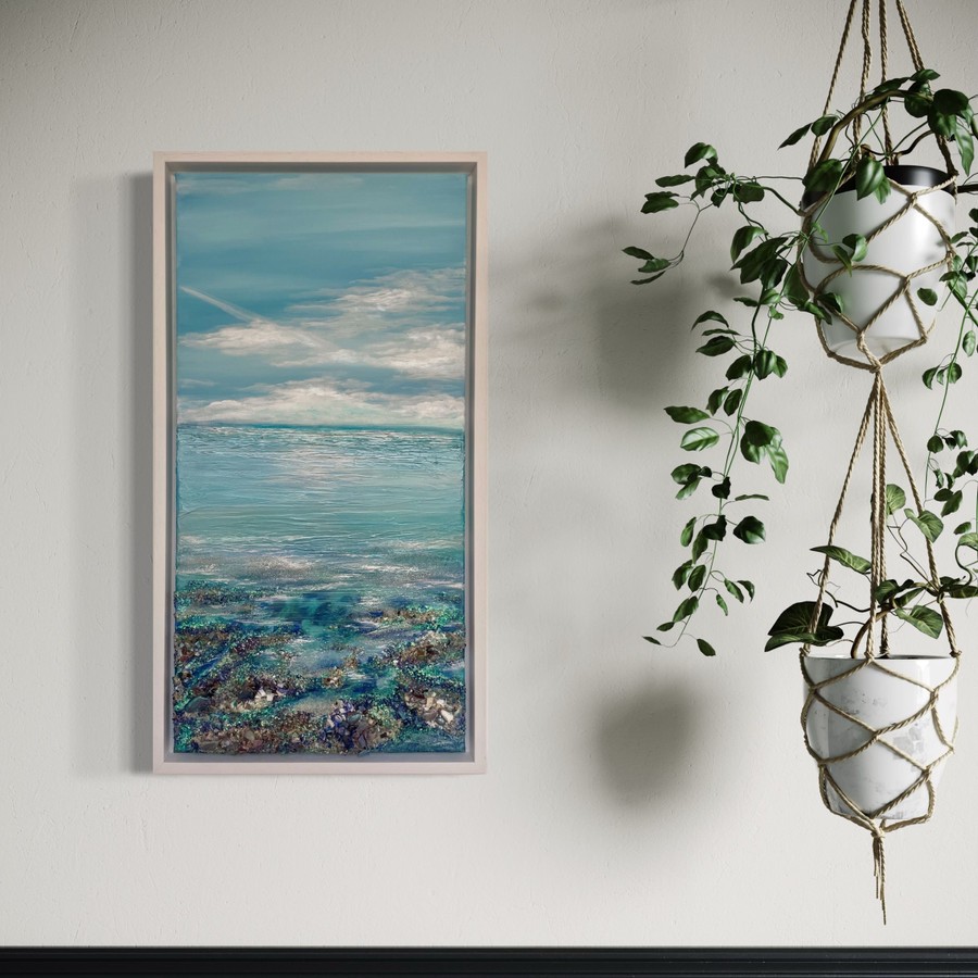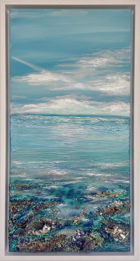 Sunlight catches the surface of still water, illuminating the delicate world within. ‘Rockpool Waters’ captures the quiet clarity of midday by the shore—where the tide has retreated, leaving behind shimmering pools that reflect the sky.