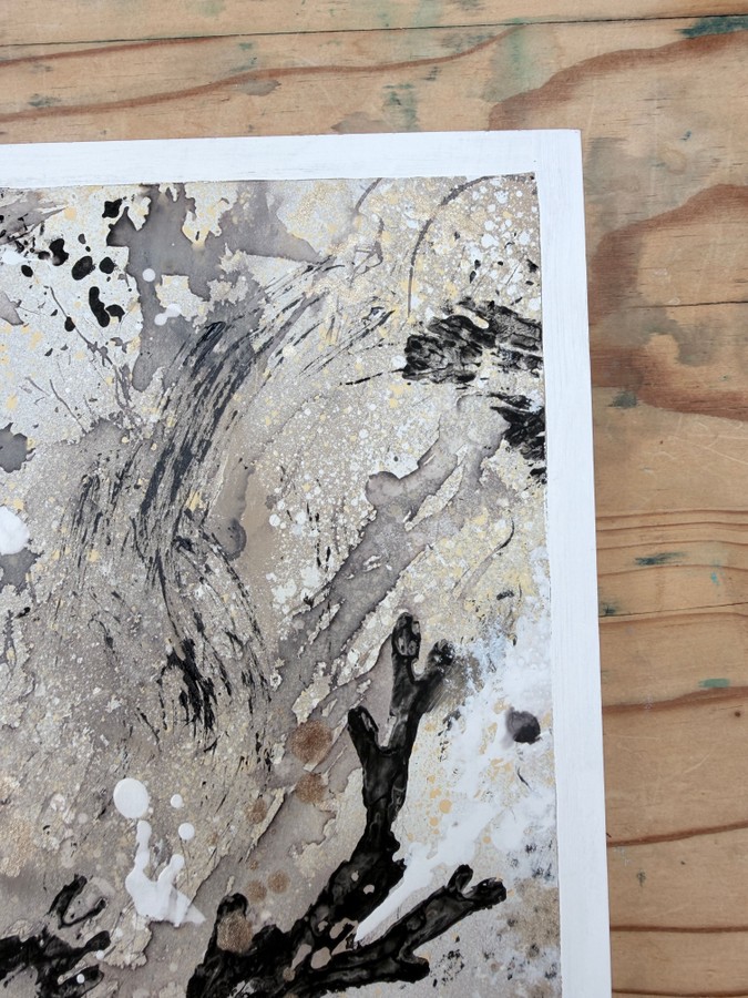An expressive coastal abstraction inspired by the shifting forms of seaweed and tide-washed textures at dusk. Layers of soft neutrals, charcoal tones and pale gold create a sense of movement, as if the shoreline is being gently rearranged by the tide.