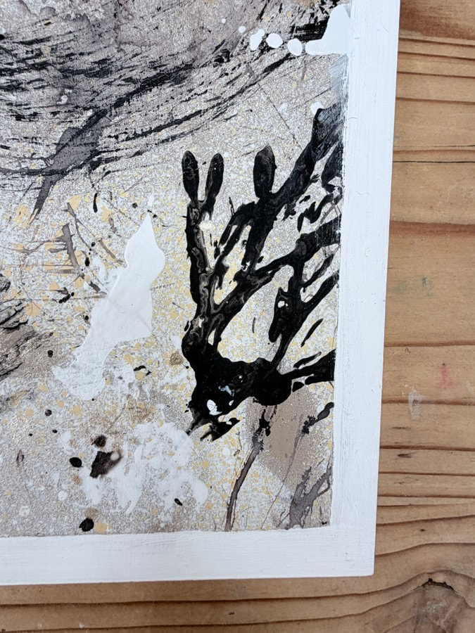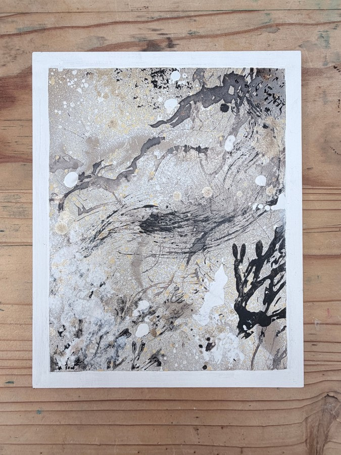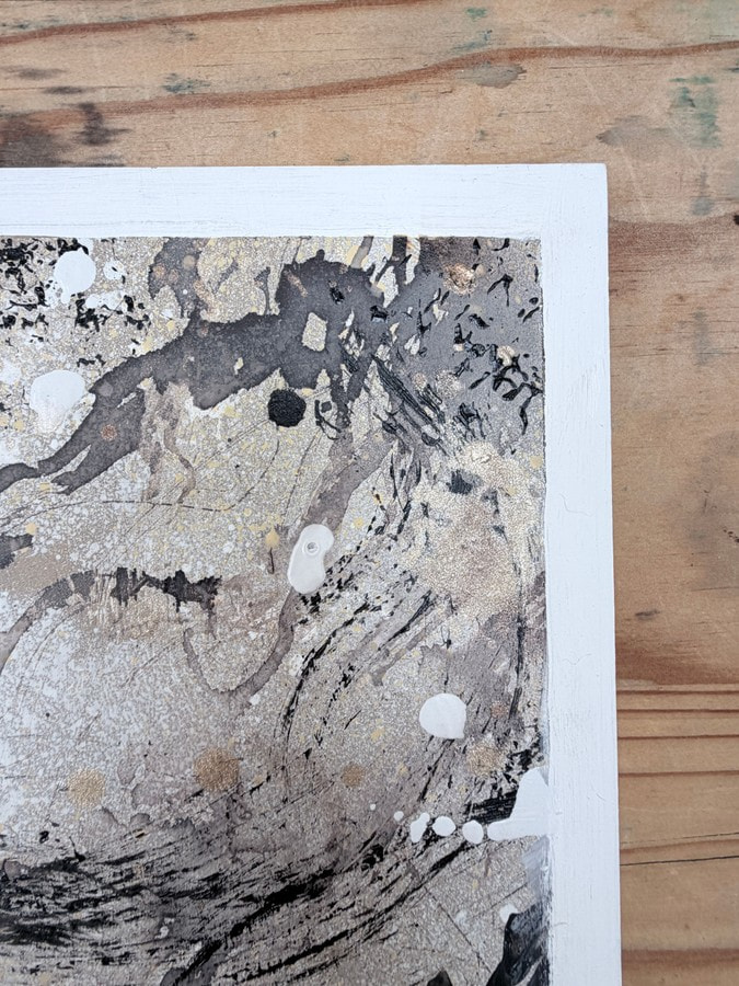 An expressive coastal abstraction inspired by the shifting forms of seaweed and tide-washed textures at dusk. Layers of soft neutrals, charcoal tones and pale gold create a sense of movement, as if the shoreline is being gently rearranged by the tide.