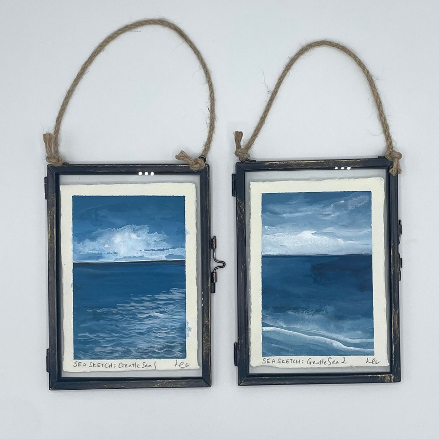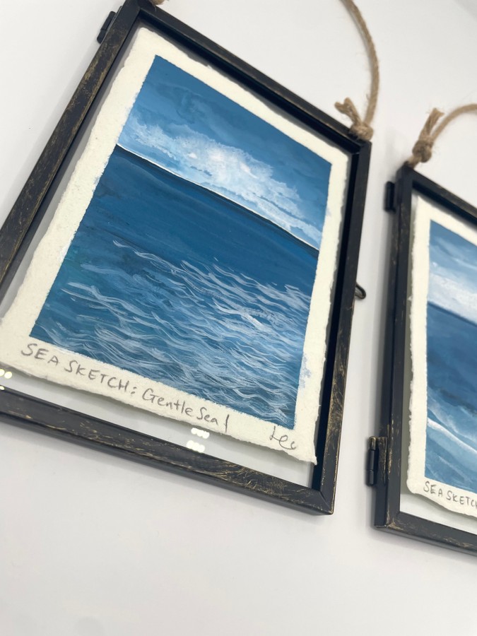 The horizon, where sea and sky converge, has always been a place of wonder for me. My 'Sea Sketch' collection reflects the fluid relationship between clouds and open sky, capturing the sense of infinite possibilities. Each seascape is painted on handmade cotton khadi rag paper, its deckled edges enhancing the natural beauty, and displayed in a sleek hanging metal frame.