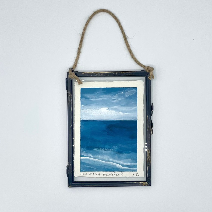 I've always been drawn to the way the sky opens up over the sea, hinting at the unknown. In the 'Sea Sketch' series, I explore this ever-changing interplay of clouds and sky, representing the endless possibilities that stretch beyond the horizon. Each painting is crafted on handmade cotton khadi rag paper with a deckled edge and framed in a delicate hanging metal frame.