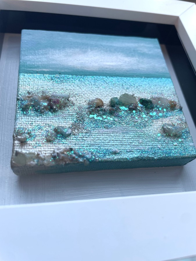 The artwork, meticulously crafted on a small canvas, captures the essence of the sea's brilliance and radiance. Infused with reflective materials, the painting mirrors the captivating glimmer and glistening allure of the ocean's surface. Real natural flower Amazonite gemstones are delicately incorporated; these gemstones are known to empower one to search the self and discover one’s own truths and integrity, and to move beyond fear of judgment or confrontation. A positive energy to have nearby in your home.