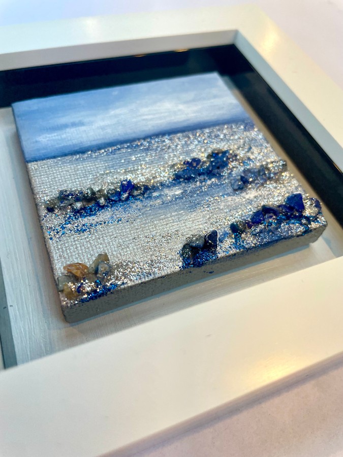 The artwork, meticulously crafted on a small canvas, captures the essence of the sea's brilliance and radiance. Infused with reflective materials, the painting mirrors the captivating glimmer and glistening allure of the ocean's surface. Real lapis lazuli gemstones are delicately incorporated; these gemstones are known to bring wisdom, understanding, and clarity to all those who keep it close by.