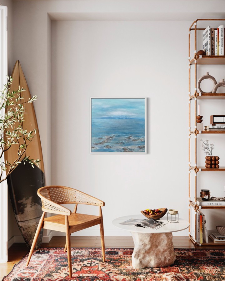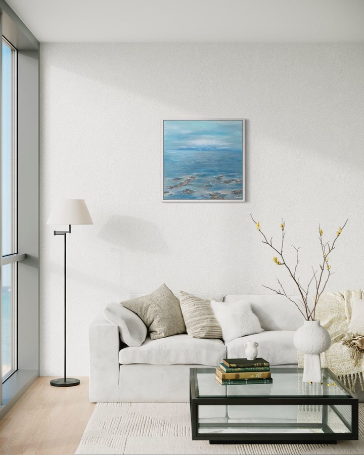 Capturing that calm moment when the sun is rising and is glistening down onto the perfectly still waters in the rock pools of the beach. Stepping onto the pebble stones, looking to the horizon, and taking in a restorative breath, to calm the mind and to meditatively take in the moment. The gemstone crystals glint tenderly from the shingly rockpools, as if welcoming a new day. Inspired by Peacehaven (East Sussex) beaches and seas.