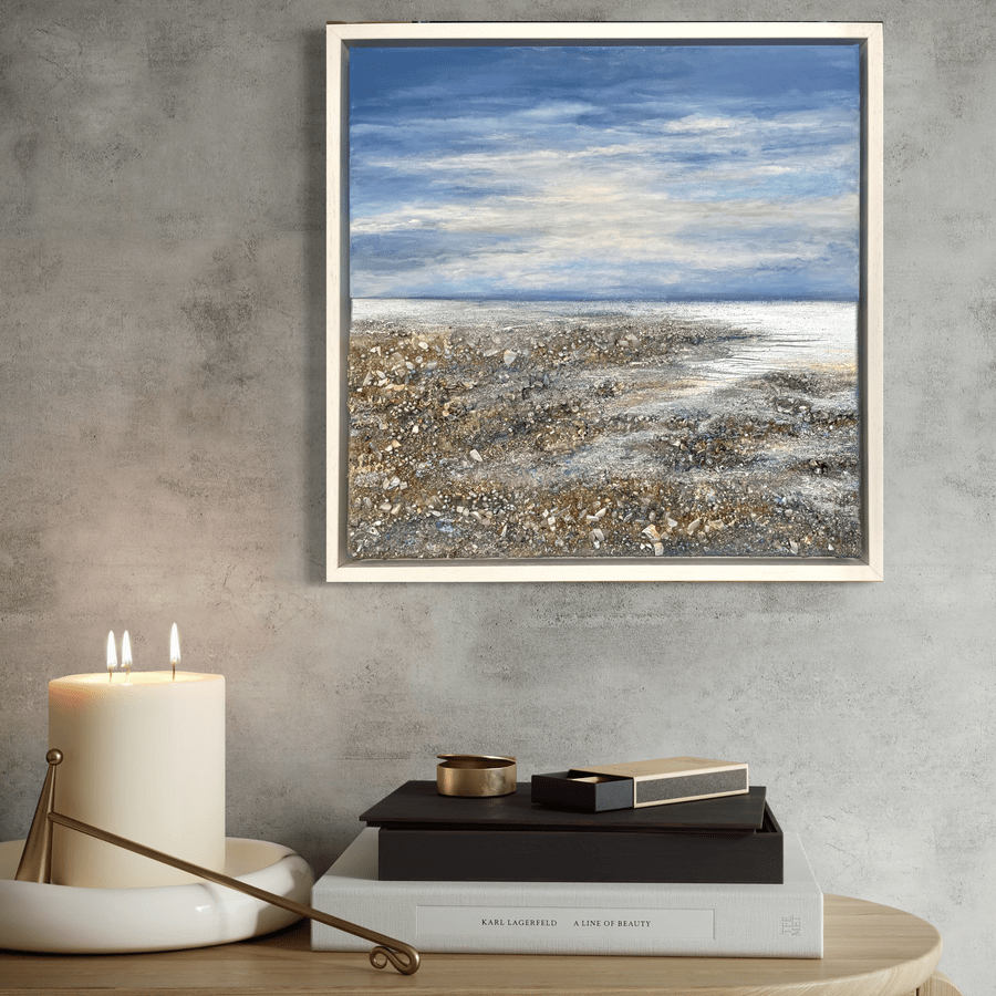 A contemplative seascape alive with texture and subtle shimmer. Embedded crystals and found materials echo the quiet pause of the shoreline, where land and sea meet in balance.