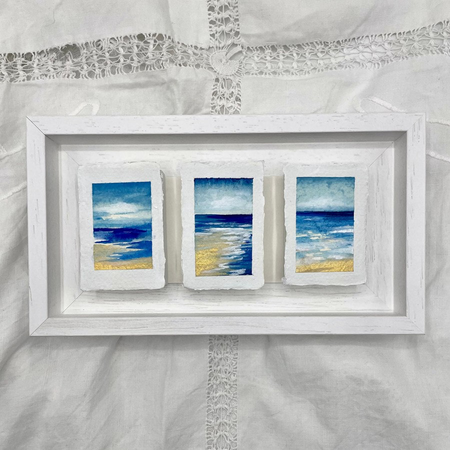 Housed as a triptych in an open floating frame, and hand signed by the artist. On A8 sized Khadi rag paper with deckled edges.